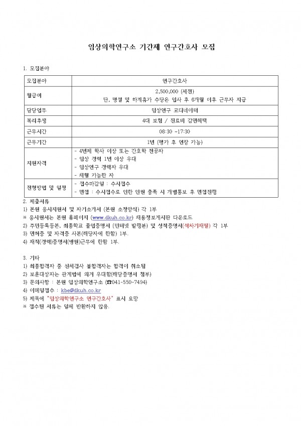 임상의학연구소 기간제 연구간호사 모집