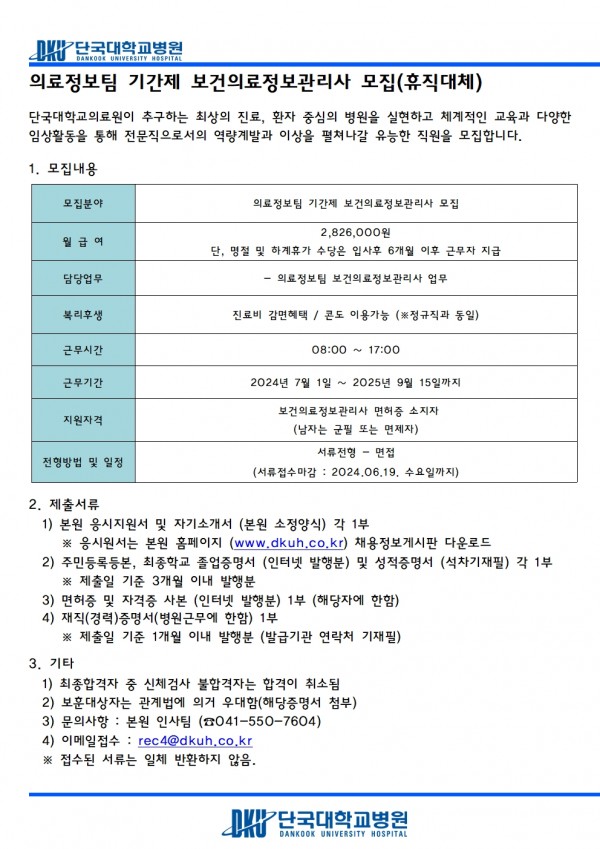 의료정보팀 기간제 보건의료정보관리사 모집(휴직대체)