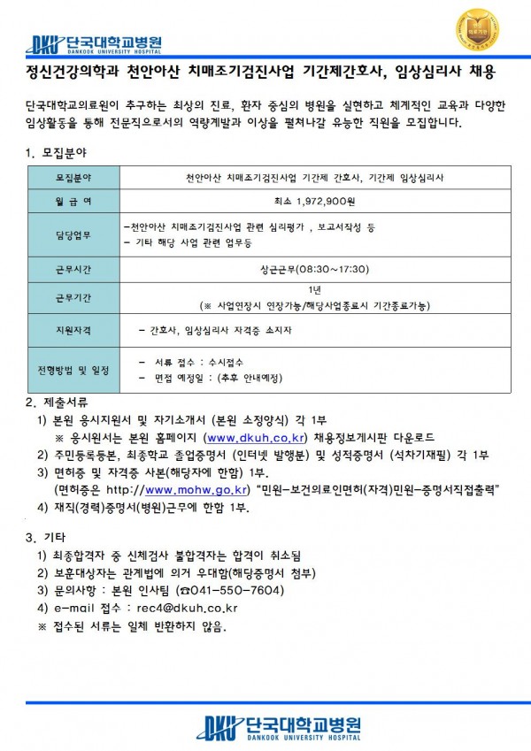 정신건강의학과 천안아산 치매조기검진사업 기간제간호사, 임상심리사 채용