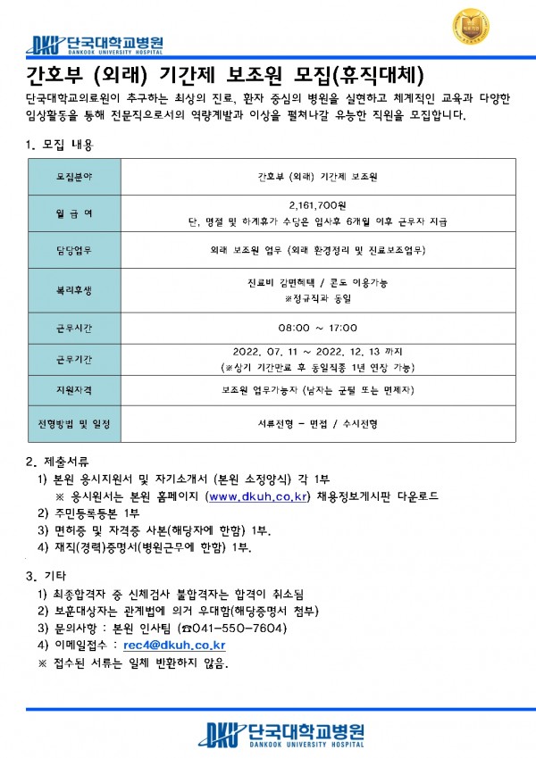 간호부 (외래) 기간제 보조원 모집(휴직대체)