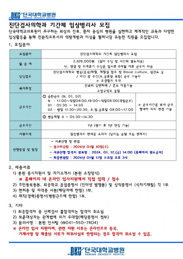 진단검사의학과 기간제 임상병리사 모집 페이지 정보 작성자 | 김혜원 작성일 | 작성일24-01-02 17:58 조회 | 16,550회 댓글 | 0건 관련링크 이전글 다음글 목록 본문 이전글 다음글 목록