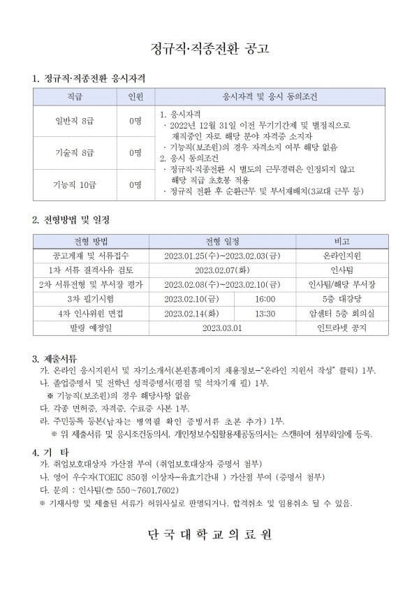 정규직 직종전환 > 병원소개 > 병원소식 > 채용공고 | 사랑이 숨쉬는 인술의 요람 - 단국대학교병원 홈페이지입니다.