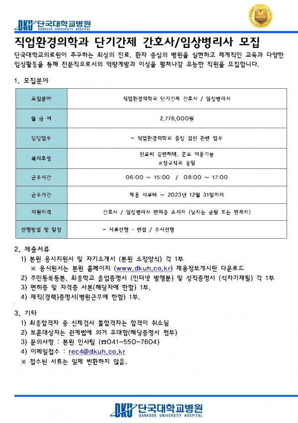 직업환경의학과 단기간제 간호사/임상병리사 모집