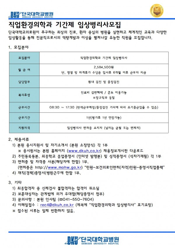 직업환경의학과 기간제 임상병리사 모집