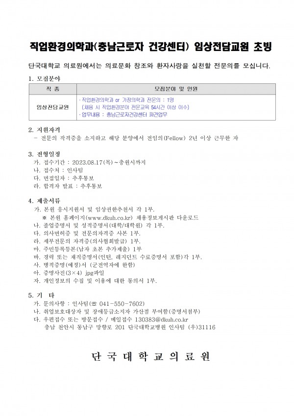 직업환경의학과(충남근로자 건강센터) 임상전담교원 초빙