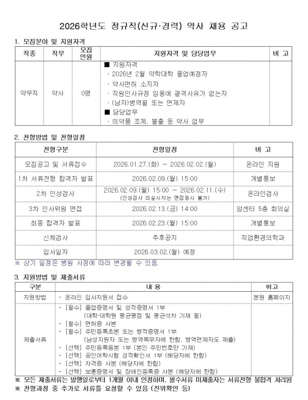 2026학년도 정규직(신규·경력) 약사 채용 공고