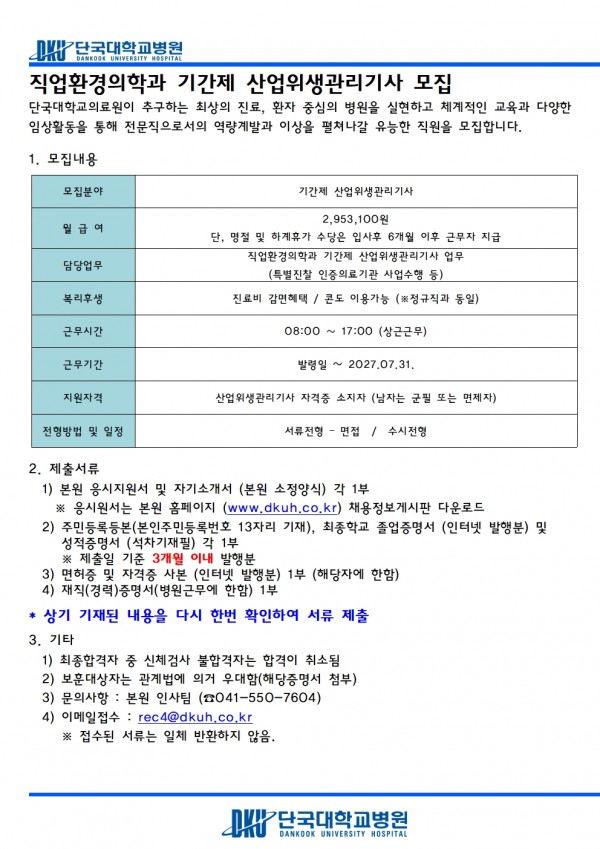직업환경의학과 기간제 산업위생관리기사 모집(육아휴직 대체)