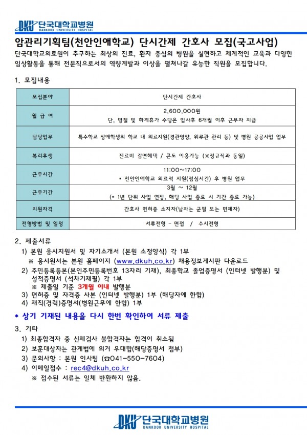 암관리기획팀(천안인애학교) 단시간제 간호사 모집(국고사업)