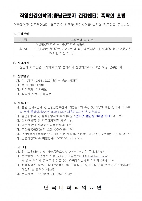 직업환경의학과(충남근로자 건강센터) 촉탁의 초빙