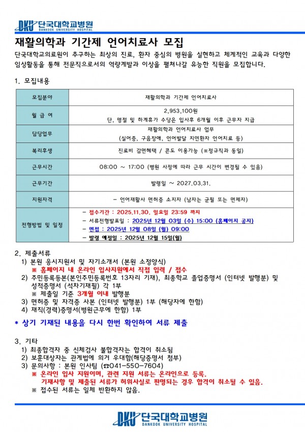 재활의학과 기간제 언어치료사 모집(육아휴직 대체) > 병원소개 > 병원소식 > 채용공고 | 사랑이 숨쉬는 인술의 요람 - 단국대학교병원 홈페이지입니다.