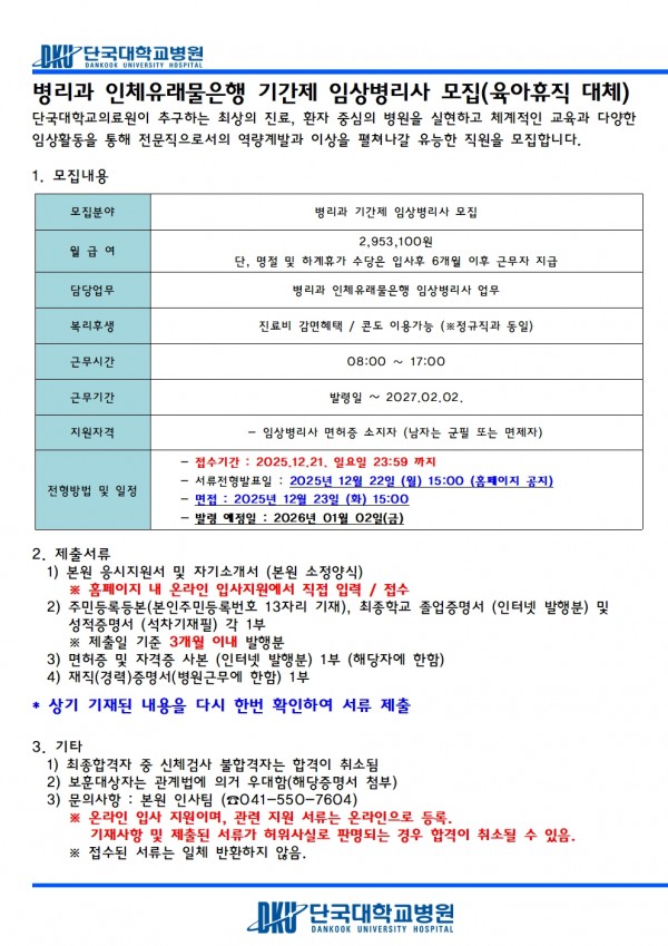 병리과 인체유래물은행 기간제 임상병리사 모집(육아휴직 대체) > 병원소개 > 병원소식 > 채용공고 | 사랑이 숨쉬는 인술의 요람 - 단국대학교병원 홈페이지입니다.