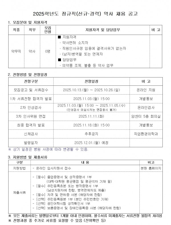 2025학년도 정규직(신규·경력) 약사 채용 공고
