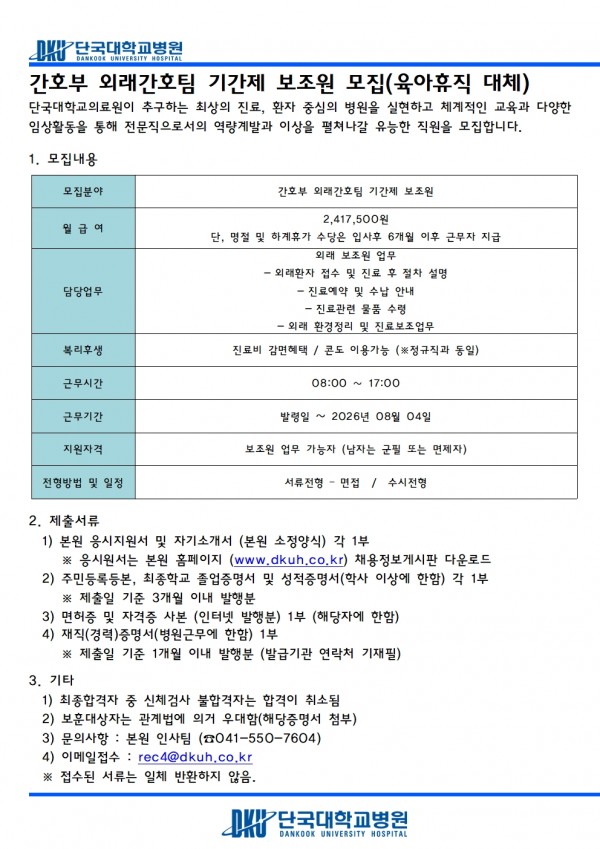 간호부 외래간호팀 기간제 보조원 모집(육아휴직 대체)