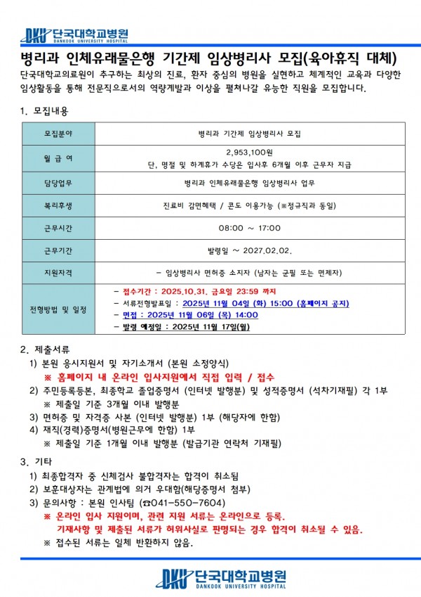 병리과(인체유래물은행) 기간제 임상병리사 모집(육아휴직 대체) > 병원소개 > 병원소식 > 채용공고 | 사랑이 숨쉬는 인술의 요람 - 단국대학교병원 홈페이지입니다.