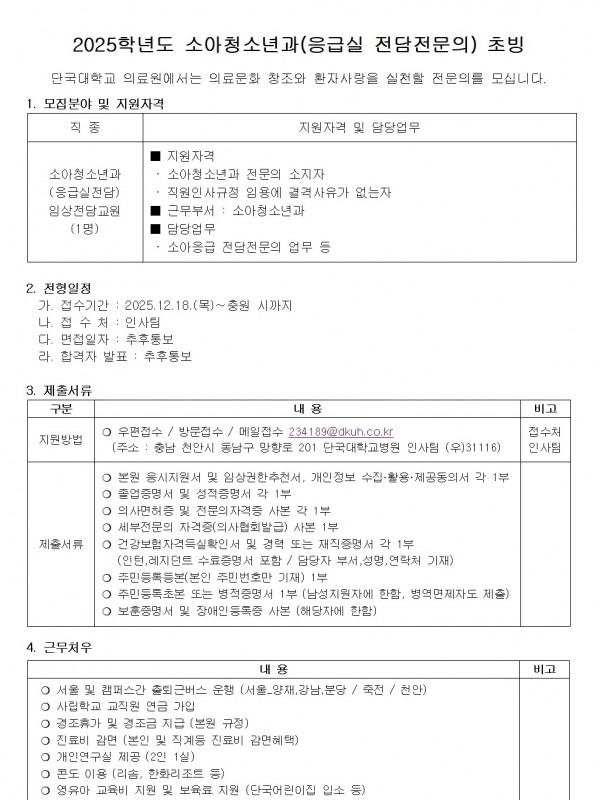 2025학년도 소아청소년과(응급실 전담전문의) 초빙
