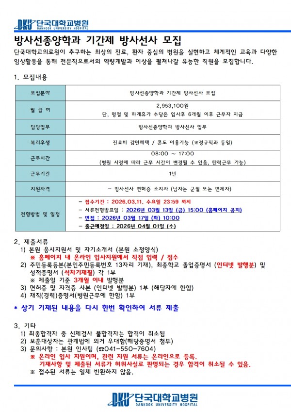 방사선종양학과 기간제 방사선사 모집 페이지 정보 작성자 | 김진우 작성일 | 작성일26-03-04 13:02 조회 | 429회 댓글 | 0건 관련링크 이전글 다음글 목록 본문 온라인 지원서 작성 온라인 지원서 작성 이전글 다음글 목록