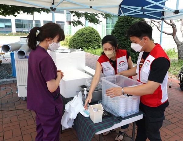 불볕더위가 기승을 부리던 지난 26일, 단국대병원(병원장 김재일)에 2대의 푸드트럭이 출동했다. 코로나19 대응의 최전선에서 고생하고 있는 의료진과 종사자들을 위해 희망브리지 전국재해구호협회와 배달의민족이 ‘찾아가는 푸드트럭’이라는 즐거운 이벤트를 마련해 여름철 간식을 지원한 것이다.