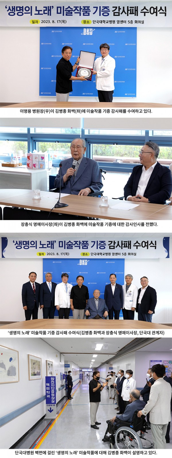 감사패를 전달하며 이명용 단국대병원장은 “<생명의 노래>라는 미술작품이 우리 병원에 전시되어 환자분들의 마음을 치유하는데 큰 도움이 되고 있다. 좋은 작품을 기증해 주신 김병종 작가님께 감사의 마음을 전하며, 단국대병원이 질병만 고치는 것이 아니라 환자분들의 마음까지 치유하는데 힘을 다할 것”이라고 전했다.
