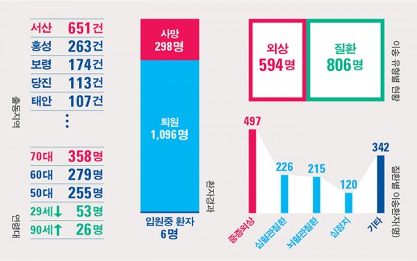 발생 사유별로 보면 질환이 806명(57.6%), 외상이 594명(42.4%)이었다. 질환별로 보면 중증외상 497명(35.5%)으로 가장 많았고, 심혈관질환 226명(16.1%), 뇌혈관질환 215명(15.4%), 심정지 120명(8.6%), 기타 342명(24.4%)으로 집계됐다. 출동 지역은 서산이 651건(46.5%), 홍성 263건(18.8%), 보령 174건(12.4%), 당진 113건(8.1%), 태안 107건(7.6%) 등의 순이었다. 그 외 경기 평택·안성, 대전, 충북 진천지역에서도 닥터헬기로 이송되어 치료받기도 했다. 이송 환자 1,400명 중 1,096명은 건강상태가 호전되어 퇴원했으며, 6명은 현재 입원치료 중으로 78.7%의 생존율을 보였다. 나머지 298명(21.3%)은 과다출혈, 의식저하, 이송 후 심정지 등 상태 악화로 숨을 거뒀다.