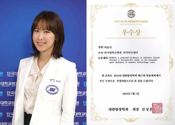 충남권역외상센터 허윤정 교수가 지난 7월 1일 부산 BEXCO에서 열린 ‘제17회 대한탈장학회 학술대회’에서 우수 구연상을 받았다. 학회에서 발표한 연구주제는 'REBOA(대동맥내 풍선폐쇄 소생술)가 외상성 대량 출혈 환자의 임시 폐복 후 배벽 봉합에 미치는 영향(교신저자: 외상외과 김동훈 교수)'에 대한 것이다.