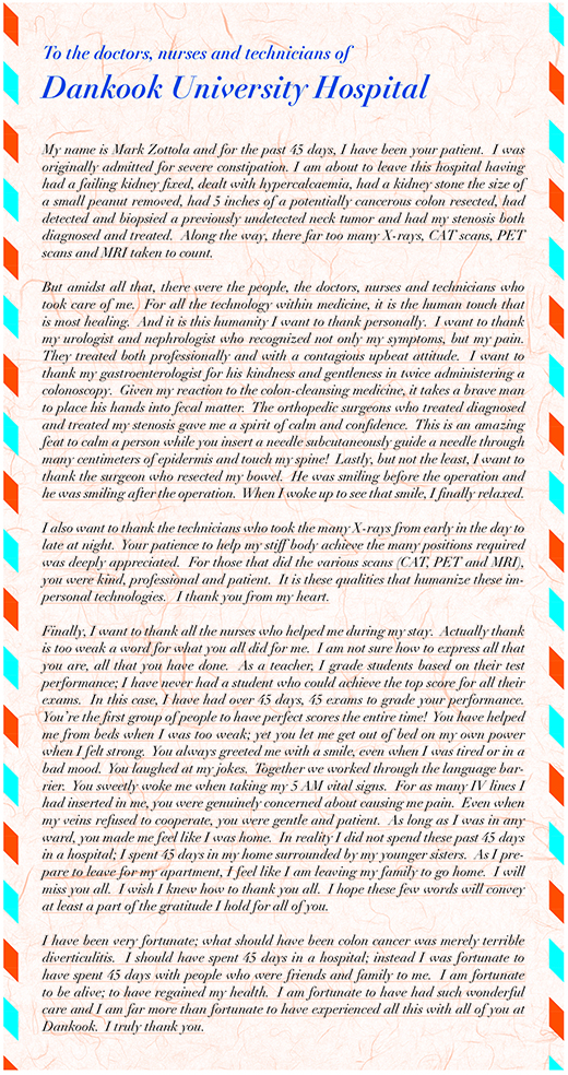 저는 매우 운이 좋았습니다. 70% 이상 대장암으로 의심됐던 것은 단순히 심한 게실염이었습니다. 병원에서 45일을 보냈지만 저에게는 친구이자 가족같은 분들과 함께 지낼 수 있어서 정말 큰 행운이었습니다. 살아서 또 다시 건강을 회복해서 다행입니다. 또한 이러한 훌륭한 보살핌을 받을 수 있어서 행복했고 이 모든 것을 단국대병원에서 여러분 모두와 함께 경험했다는 것은 단순한 행복 이상이었습니다.