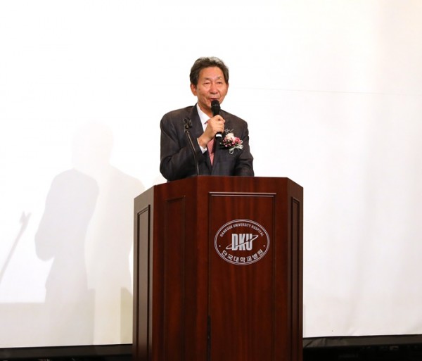 (충남지역암센터 개소식에 장호성 단국대학 이사장이 인사말을 하고 있다)