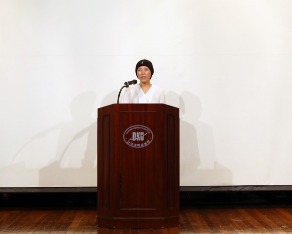 (유방암 생존자인 김은경 환우가 직접 연자로 나서 본인의 암치료 경험담을 들려주고 있다)
