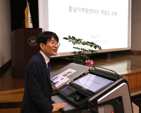 (국립암센터 임정수 본부장이 충남지역암센터의 역할과 과제 강연을 진행했다)