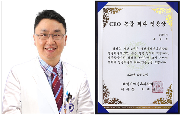 단국대병원(병원장 조종태) 이비인후과 우승훈 교수가 ‘제25차 이비인후과 종합학술대회’에서 ‘CEO 논문 최다 인용상’을 수상했다. 대한이비인후과학회 주최로 지난 17일, 18일 양일간 여수엑스포컨벤션센터에서 열린 이비인후과 종합학술대회에서 우 교수는 그간의 우수한 학술적 연구 성과를 통해 학회에 기여한 공로를 인정받아 수상하게 됐다.