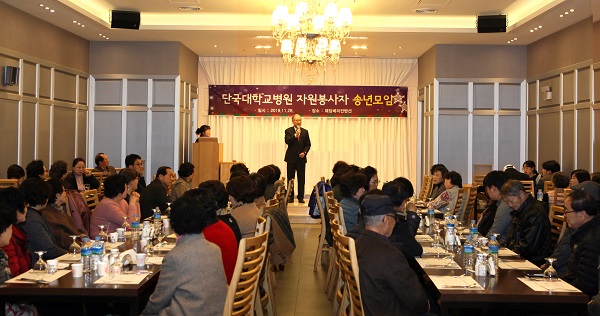 단국대학교병원은 28일 구성동 베리뷔페에서 병원 내에서 활동하고 있는 자원봉사자들을 위한 특별한 자리를 마련했다. 지난 해에 이어 두 번째로 진행된 이번 송년회는 올 한 해 동안 보이지 않는 곳에서 묵묵히 병원에 도움을 준 자원봉사자들의 노고에 감사의 마음을 전하고 격려하는 자리로 이성재 대외협력실장과 자원봉사자, 천주교/기독교 원목실 등 100여 명이 참석한 가운데 진행됐다.