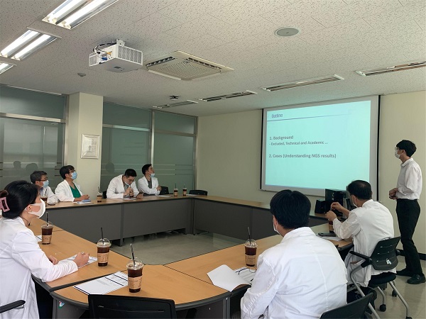 박동국 실장을 비롯하여 외과, 내과, 산부인과 등 20여 명의 의료진이 참석한 이번 세미나는 단국대병원 NGS 임상검사 소개, 결과지 해석에 방향에 대한 발표(임상연구조교수 신원석)와 함께 관련된 내용에 대한 토론으로 진행되었다.