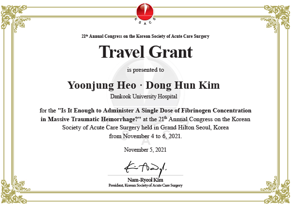 수상의 영광을 안겨준 이번 논문은 외상성 대량출혈 환자에게 맞춤형 피브리노겐 약물을 투여했을 때 사망률 감소에 미치는 영향과 투여용량의 적정성을 평가한 연구였다.
