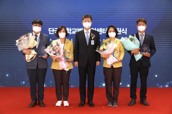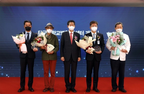 (김재일 의료원장, 박우성 암센터추진위원장, 최희동 대유건설 대표, 박종훈 도예학과 석좌교수가 유공자 표창을 받았다)