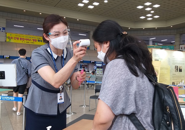 (직원을 비롯한 환자, 보호자 등 모든 내원객에게 발열체크를 시행하고 있다.)