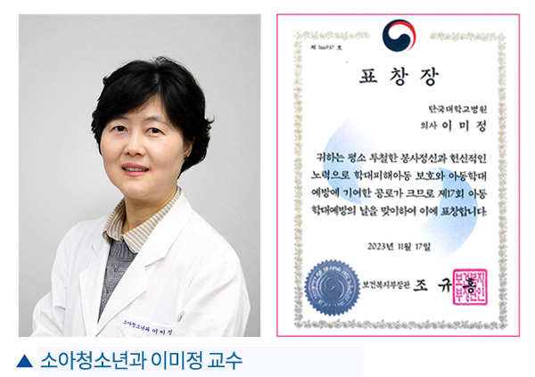 소아청소년과 이미정 교수(과장, 충청남도 광역새싹지킴이병원 아동보호위원회 위원장)가 지난 11월 17일 서울 가든호텔 그랜드볼룸 홀에서 열린 ‘2023년 아동학대 예방의 날 기념식’에서 아동학대 예방 및 대응에 기여한 공로를 인정받아 보건복지부장관 표창을 수상했다.
