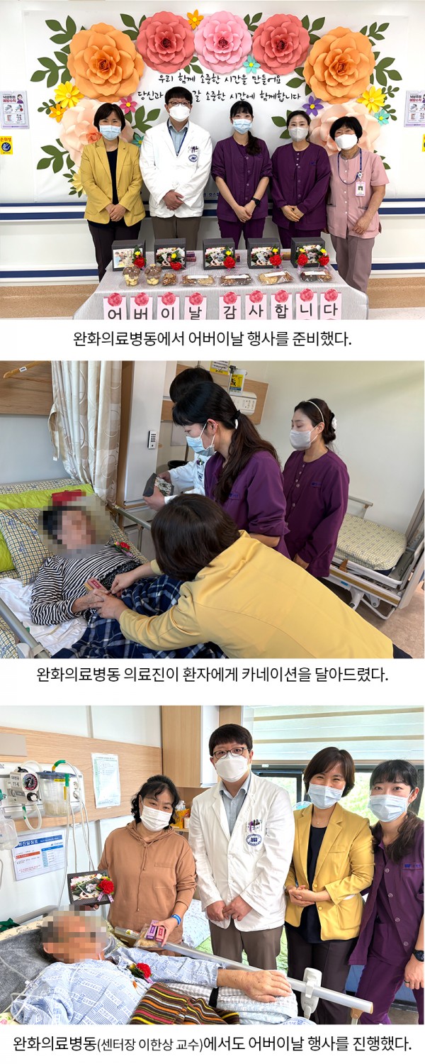 한편 완화의료병동에서도 병동에 재원 중인 환자와 보호자 대상으로‘어버이날 행사’를 실시하였다. 병동 의료진들은 카네이션 달아드리기, 선물(침상 선풍기), 사진 촬영을 진행하며 환자와 보호자에게 좋은 추억을 선사했다.