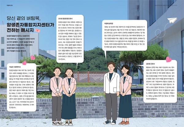 소식지는 센터 이용안내부터 센터 주관 대표 행사인 ‘암 생존자주간행사’와 행사 스케치 등이 담겨 생생한 현장 분위기를 전했다. 또한 ‘암생존자 일상 회복을 위한 작은 연습’ 코너에서는 신체 건강 프로그램, 심리지지 프로그램, 생활·사회 복귀 프로그램 등 센터가 제공하는 통합지지프로그램의 내용을 상세히 안내해 암 생존자들의 일상 회복에 실질적인 도움을 주고자 했다. ‘마음의 온도’ 페이지에는 센터 직원들과 이정재 센터장의 환자에 대한 진심 어린 메시지가 담겨 있어, 이번 소식지의 핵심이자 감동 포인트로 자리매김했다. 또한 ‘깃드는 마음’ 코너에서는 센터와 깊은 인연을 맺은 암 생존자의 이야기를 담아 진정성 있는 공감과 위로를 전한다.