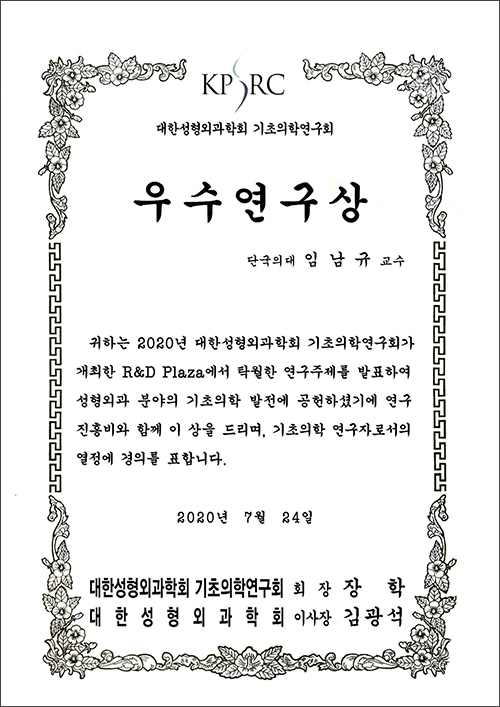 단국대병원 성형외과 임남규 교수가 지난 7월 24일부터 25일 양일간 온라인으로 진행된 제10회 대한성형외과학회 기초재건학회에서 '우수연구상'을 수상했다.