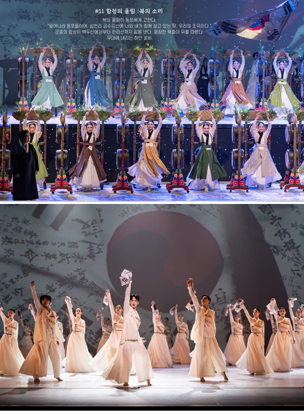 공연은 미디어아트와 무용을 결합해 ▲1막(조선과 대한제국) ▲2막(성장, 자유를 향해) ▲3막(독립의 노래) ▲4막(타오르는 불꽃) ▲5막(해방의 춤) ▲에필로그(박달나무의 꿈, 꽃을 피우다)로 구성된다. 무용과 재학생 80명으로 구성된 무용단은 화려한 군무와 역동적인 퍼포먼스, 한국적 오브제를 통해 아름다운 춤사위를 표현한다.