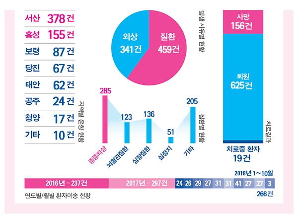 또 닥터헬기 출동지역은 서산이 378건(47.3%)으로 가장 많았고, 홍성 155건(19.4%), 보령 87건(10.9%), 당진 67건(8.4%), 태안 62건(7.8%), 공주 24건(3.0%) 순이었으며, 대전광역시를 포함해 경기 안성 등 닥터헬기가 출동하는 지역도 확대되었다. 이송된 환자 800명 중에 625명은 수술 및 입원치료 등으로 상태가 호전되어 퇴원했으며, 19명은 입원치료 중으로 80.5%의 생존율을 보였다. 나머지 156명은 과다출혈, 의식저하 등 상태 악화로 숨을 거뒀다.