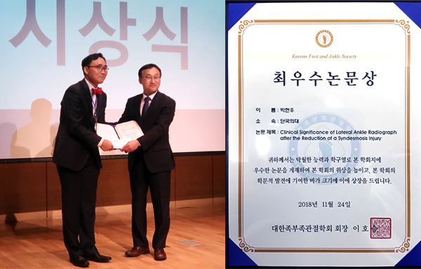 수상의 영광을 안긴 이번 논문은 원위 경비인대 결합이 손상된 발목 골절 환자의 수술시 정복의 적절성을 평가하기 위해 수술실에서 촬영되는 발목의 측면 영상에서 정확한 정복을 판단하는 새로운 지표를 찾아 제시했다는 평가를 받았다. 논문은 대한족부족관절학회지(학진등재지) 2017년 12월호에 ‘원위경비인대결합 손상 정복 후 관찰된 측면 방사선 영상의 임상적 중요성’의 제목으로도 출판되었다.