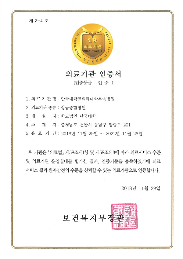 단국대학교병원이 중부지역에서는 처음으로 3주기 의료기관인증을 획득했다.