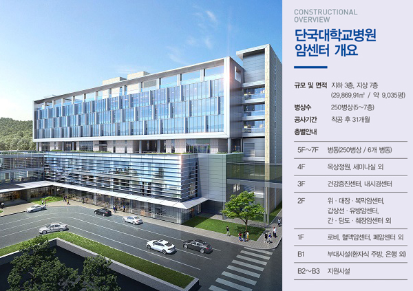 고령사회가 되면서 한국인의 사망원인 1위를 차지하고 있는 암으로부터 지역주민의 건강을 지키고자 단국대병원(병원장 조종태)이 암센터를 건립한다. 2021년 완공 예정인 암센터는 지하 3층, 지상 7층 건물(연면적 29,869.91㎡)에 250병상 규모를 기본계획으로 암종별 센터를 비롯하여 건강증진센터 및 내시경센터 등이 들어선다.