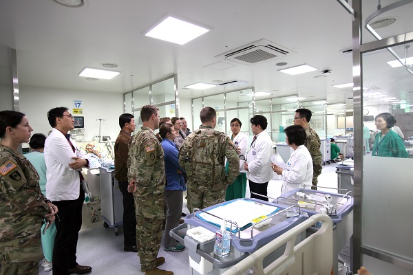 이번 방문은 평택으로 이전한 미군과 그 가족, 그리고 제대군인과 민간인들에 대한 타 병원 후송을 결정하는 의료진으로 우리 병원의 시설 및 의료진들의 진료현황을 파악하기 위해 이루어졌다. 방문단은 외상중환자실을 비롯한 중환자실과 응급실, 권역외상센터 등을 방문하여 김도형 중환자실장(호흡기알레르기내과), 권역외상센터 장성욱 교수(흉부외과), 응급의료센터 조현영 교수, 국제진료센터 박현우 소장과 이민영 부소장 등으로부터 안내를 받고 궁금한 점에 대한 질의응답 시간을 가졌다. 병원 곳곳을 둘러본 방문단은 본원의 체계적인 시스템과 첨단 시설에 만족하며 유대관계를 돈독히 하였다.