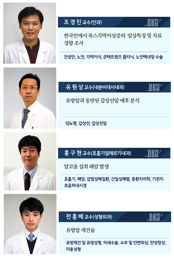 선정된 연구과제는 ▲한국인에서 푹스각막이상증의 임상특징 및 치료경향조사(안과 조경진 교수), ▲유방암과 동반된 갑상선암 예후분석(내분비대사내과 유원상 교수), ▲알코올 섭취 폐암발생(호흡기알레르기내과 홍구현 교수), ▲유방암 재건술(성형외과 전홍배 교수) 등이다.