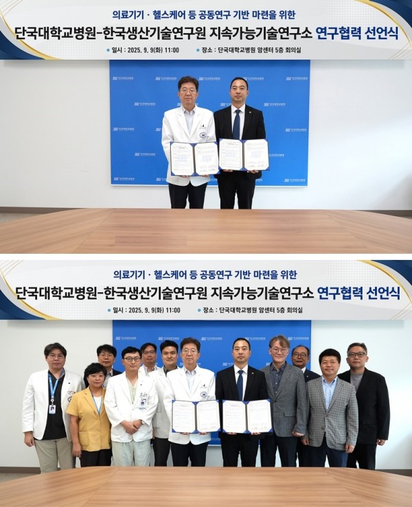 단국대병원(병원장 김재일)은 9일 암센터 회의실에서 한국생산기술연구원 지속가능기술연구소(연구소장 이창엽)와 연구협력 선언식을 열고, 의료기기 및 헬스케어 분야의 공동연구 활성화에 나서기로 했다.