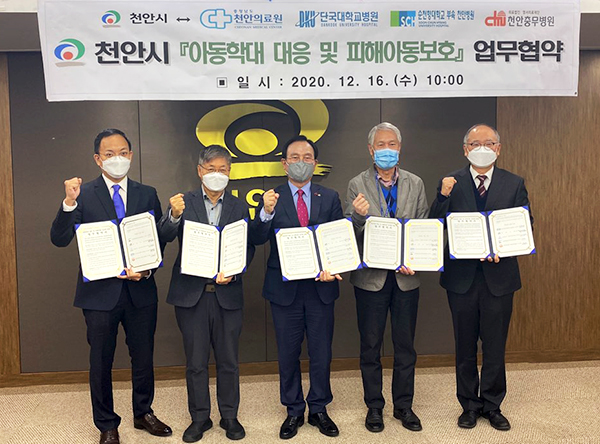 단국대병원을 포함한 관내 4개 의료기관은 지난해 12월 16일 시청 소회의실에서 천안시와 ‘아동학대 대응 및 피해아동 보호를 위한 업무협약’을 체결했다. 이날 협약식에는 박상돈 천안시장을 비롯해 우리 병원 이성재 대외협력실장, 이경석 천안의료원장, 이동욱 순천향대병원 소아응급의료센터장, 신계철 천안충무병원장이 참석해 아동학대 공동대응을 위한 협력에 뜻을 모았다.
