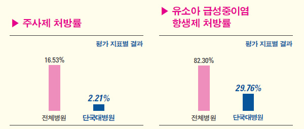 약물의 오남용은 자칫 환자의 생명에 치명적일 수 있기 때문에 필요한 환자에게 적절한 주사제와 항생제 처방이 이루어지는 것이 무엇보다 중요한 일인만큼 우리 병원은 해당 진료과의 의료진들을 대상으로 주사제 및 항생제 사용 안내를 지속적으로 실시하며 모니터링하고 있다. 한편 지난 8월에 심평원이 발표한 유소아 급성중이염 항생제 적정성평가에서도 우리 병원은 1등급을 획득한 바 있다.