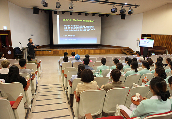 140여명이 참석한 가운데 열린 이번 행사는 특히 정신건강의학과 백기청 교수가 ?자신의 감정을 이해하여 타인에게 자신의 감정을 적절한 방법으로 전달할 수 있도록 돕기 위한 ‘우리 마음속의 방어기제’에 대한 강의가 진행되었다. 이후 임영미 웃음 임상 치료간호사가 스트레스 대처방법인 웃음치료를 통해 매일 경험하는 스트레스 상황을 자신에게 알맞은 수준으로 감정을 유지하고 관리할 수 있도록 도움을 주었다.