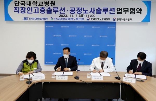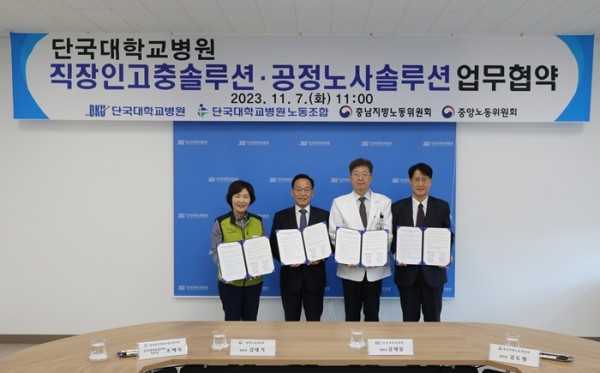 단국대병원과 충남지방노동위원회, 전국보건의료산업노동조합 단국대의료원지부가 7일 중앙노동위원회의 협조 아래 ‘직장인 고충 솔루션 및 공정 노사 솔루션 업무협약’을 체결했다. 이날 협약식에는 김태기 중노위원장, 김도형 충남지노위원장, 김재일 단국대병원장, 조혜숙 단국대의료원지부장 등이 참석했다.![]()